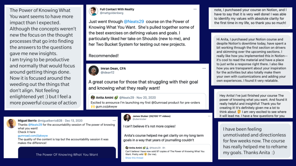 "Just went through @Neats29 course on the Power of Knowing What You Want. She's pulled together some of the best exercises on defining values and goals. I particularly liked her take on Shoulds (new to me), and her Two Bucket System for testing out new projects. Recommended!" – Matt Goldenberg